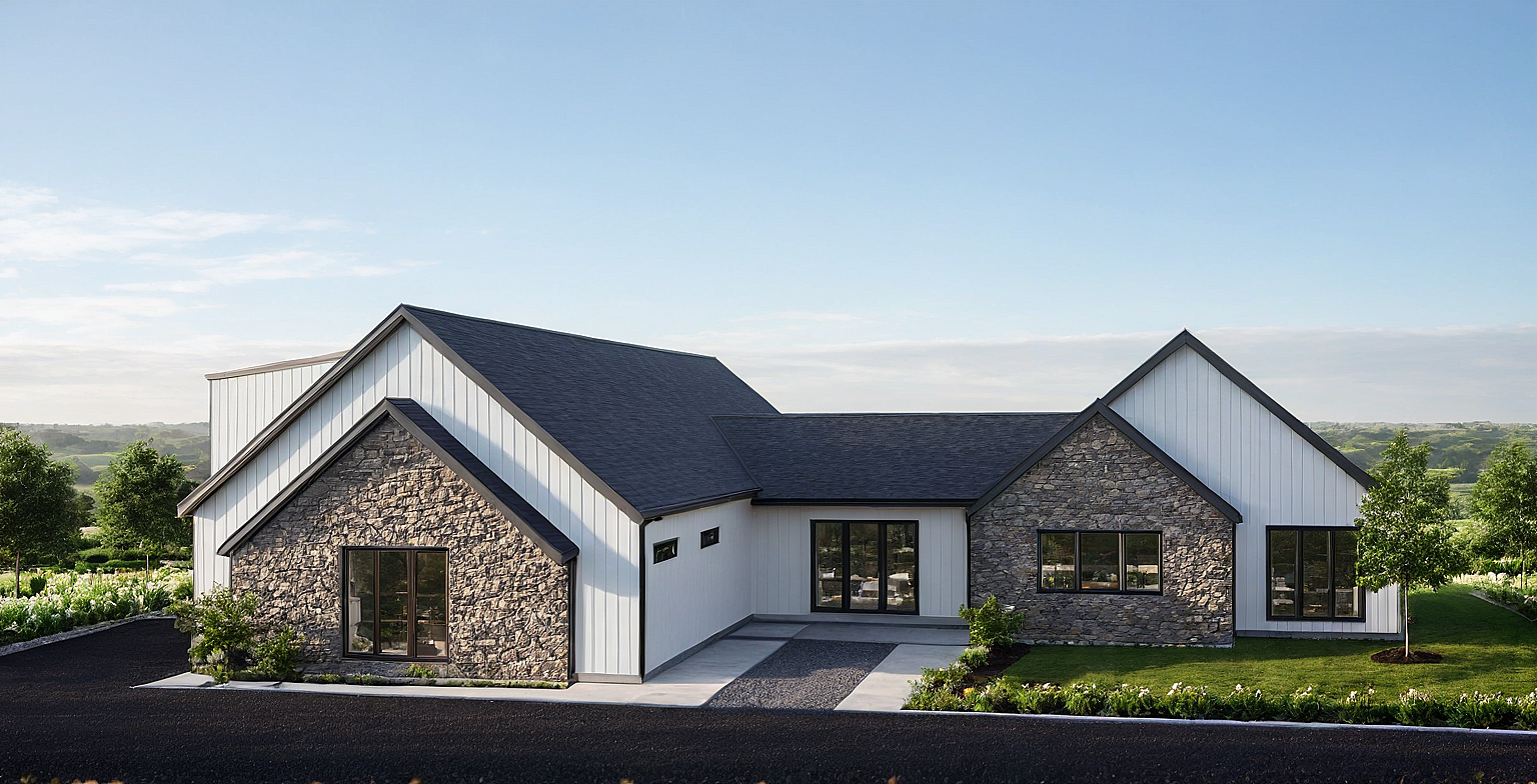 Promptplease add landscaping, greenery, flowers, make it very pretty, no vine, stone front, field back ground, vertical white siding