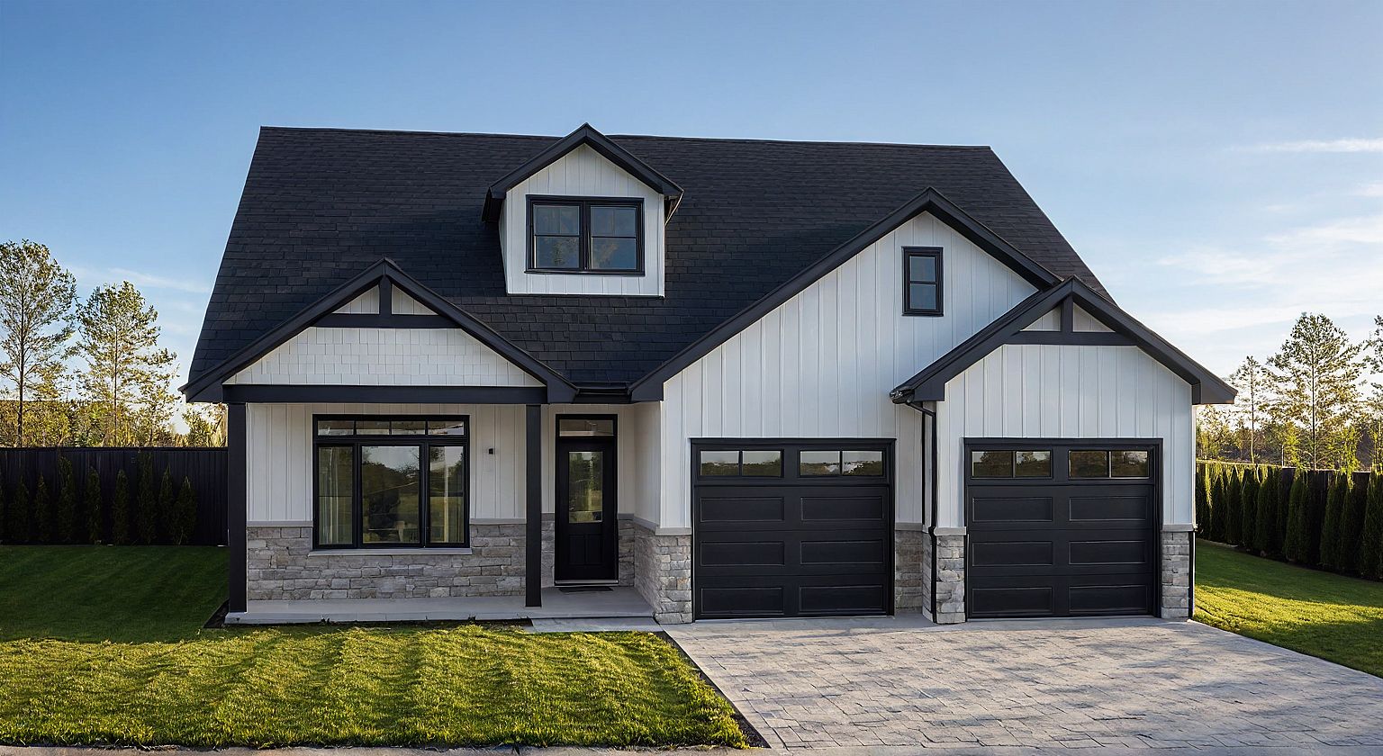 Photo of a modern single-family home featuring a combination of white siding and stone elements. Emphasize the detailed textures of the siding, contrasting black roof, and large double garage doors. Set in a suburban landscape with manicured grass and a clear sky backdrop. Natural daylight illuminates the facade, creating soft shadows. Capture a frontal perspective, using a wide-angle lens to showcase the structure's depth and surrounding space, highlighting the inviting porch and large windows for a welcoming atmosphere.